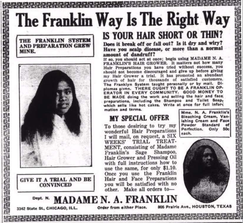 1924 ad for Madame N. A. Franklin beauty products in the Houston Informer. (Image available on the Internet and included in accordance with Title 17 U.S.C. Section 107.)